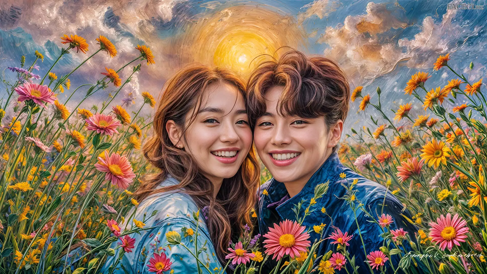 Malarstwo, Łąka, Chłopak, Dziewczyna, Kwiaty, Słońce - faceci.biz